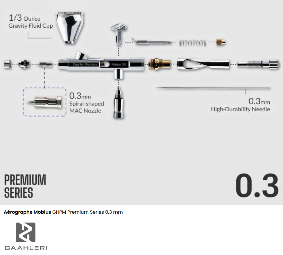 Fabriqué à partir de matériaux de qualité professionnelle, le GHPM-Mobius offre un débit de peinture constant et contrôlé, même avec des peintures acryliques, des émaux ou des laques bien diluées. Sa conception ergonomique assure un confort lors de longues sessions, tandis que la gâchette sensible offre une réponse douce et progressive pour un contrôle total du débit d'air et de peinture.