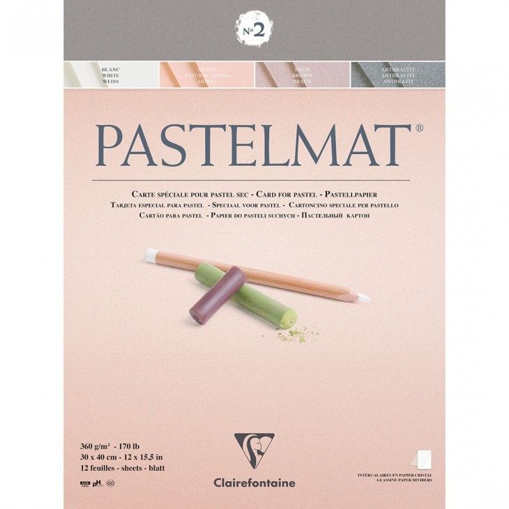 Bloc Pastelmat 30x40 n°2 : Blanc, Sienne, Brun, Anthracite. Bloc collé en tête contenant 3 feuilles de chaque teinte et un intercalaire de papier cristal pour protéger le dessin. 12 feuilles.