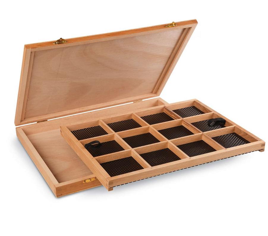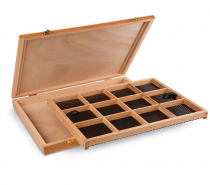 Coffret bois pour pastels avec grille. En hêtre verni. Plateau intérieur divisé en 12 casiers pour ranger les pastels par gammes de couleurs.