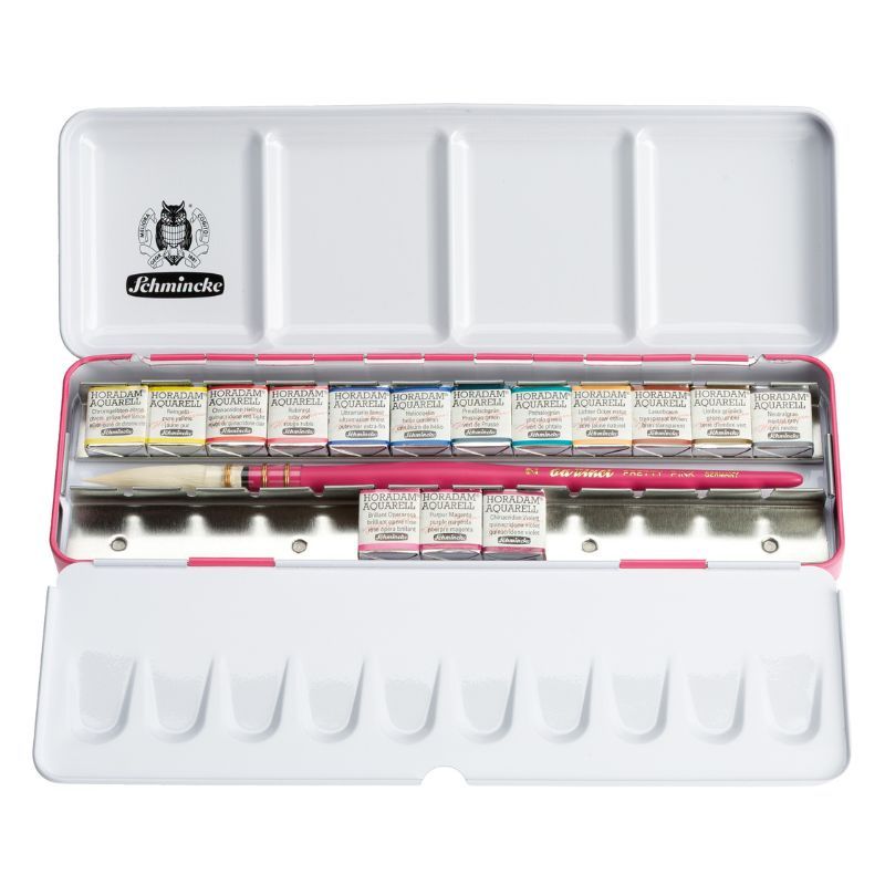 Couleurs : 211 Teinte jaune de chrome citron, 216 Jaune pur, 343 Rouge de quinacridone clair, 351 Rouge rubis, 494 Outremer extra-fin, 479 Céruléum de hélio, 528 Vert de Prusse, 519 Vert de Phtalo 656 Ocre jaune naturelle, 648 Brun transparent, 665 Terre d'ombre verte, 785 Gris Neutre, 920 rose opéra brillant, 367 pourpre magenta, 368 Quinacridone violet.