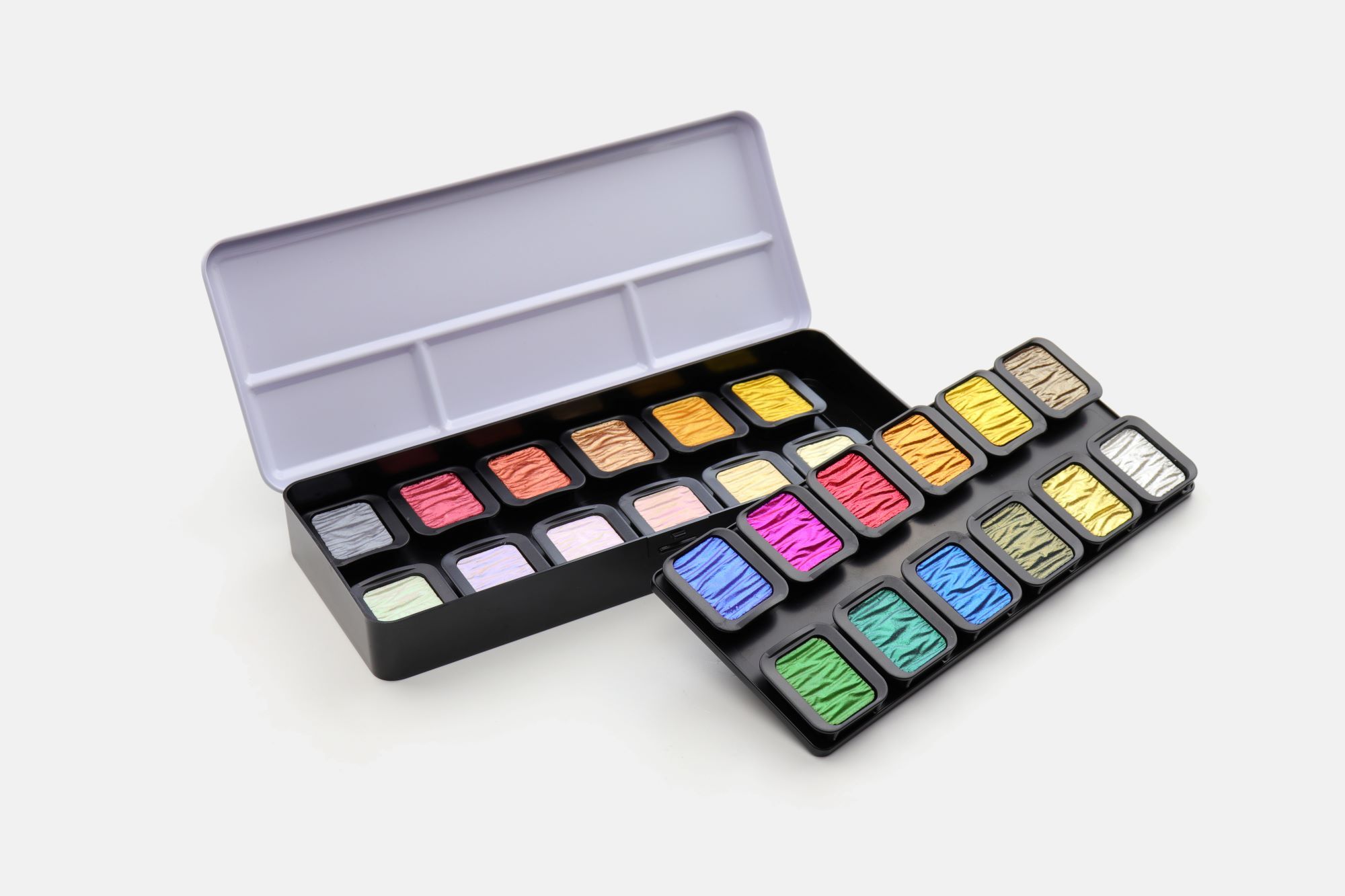 Boite métal de 24 godets d’aquarelle iridescente de qualité extra-fine.