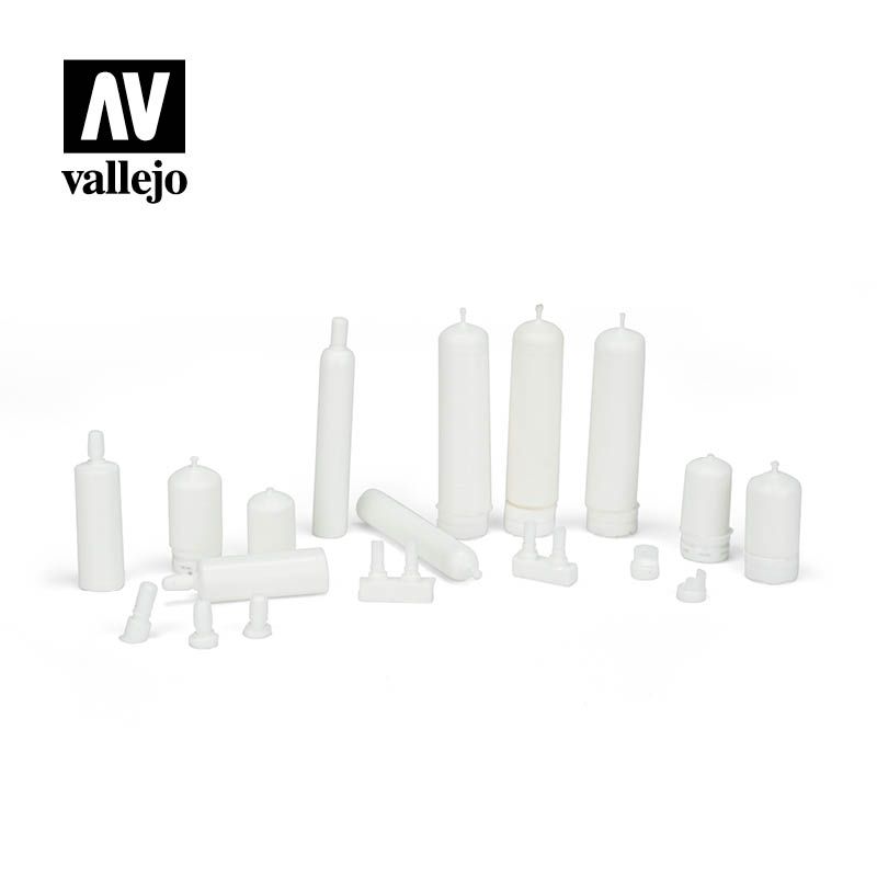 Assortiment de onze bouteilles de gaz de capacités différentes et très détaillées. Comprend des bouchons séparés pour certaines unités montrant le détail des vannes.