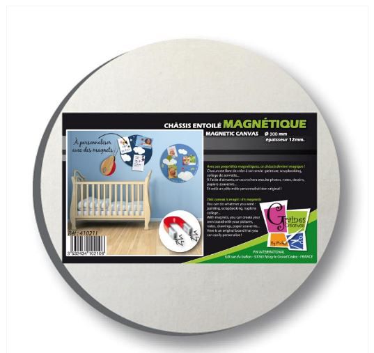 Vous pourrez décorer votre châssis magnétique rond 20 cm avec de la peinture, des paillettes, et lui ajouter des épingles à ligne magnétiques.