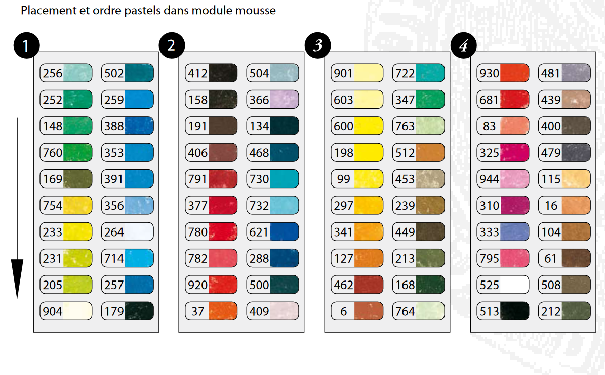 Contient 80 couleurs assorties. La gamme de pastels tendres surfins à «l'écu» est l'une des plus longues gammes chromatiques de pastels avec 525 tons au total.