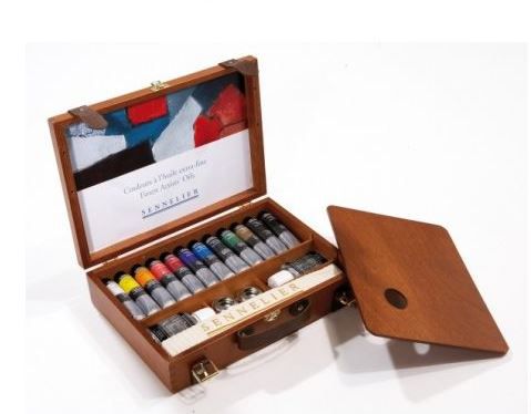 Contenu : 12 tubes d’Huile Extra-fine 40 ml flacon d’essence de Térébenthine 75 ml 1 flacon de vernis brillant à tableaux 75 ml 1 couteau à peindre 2 brosses 351 n°10 et 350 n°8 fusains Sennelier 1 godet simple métal 1 chiffon brodé Sennelier 1 palette en bois 1 nuancier imprimé