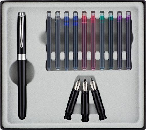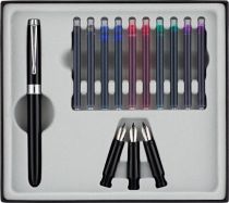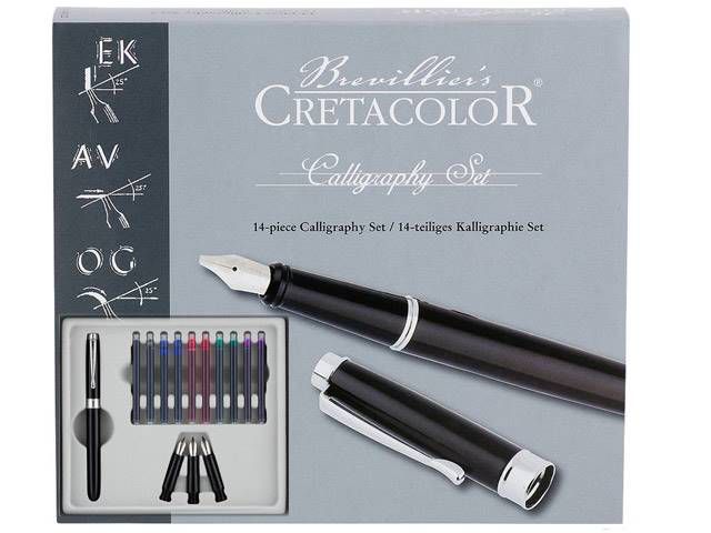 Réf. : K431.22 Coffret calligraphie de Cretacolor, 14 pièces : coffret contient un stylo métallique de haute qualité à cartouche, dans un design élégent, 3 plumes calligraphiques largeur 1.1/1.5/1.9 mm et 10 cartouches d'encre couleurs violet, vert,rouge,bleu et noir ainsi qu'une notice.