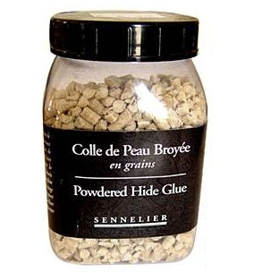 La colle de peau broyée Sennelier est réalisée à partir de peaux de lapins dont on extrait le collagène sous forme de gélatine.