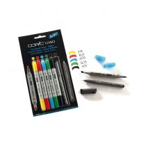 Chaque set 5+1 comprend un marqueur calibré COPIC Multiliner 0,3mm pour encrer les contours du dessin et 5 marqueurs COPIC CIAO pour la colourisation.