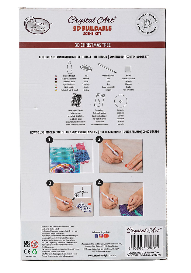 Que vais-je recevoir ? Sapin de Noël en MDF, environ 19 x 32 cm (la plaque de base a un diamètre d'environ 15 cm), imprimé à remplir, Plateau de rangement, Stylo pour contenir les pierres, Sachet de cristaux à remplir de différentes couleurs (suffisant et adapté à tous motifs), x3 Sachet vides, Plaques de cire pour le stylo.