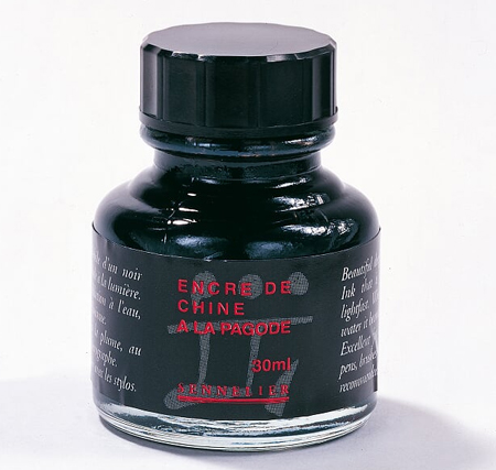 Le plus riche, le plus profond noir disponible sur le marché. L'encre de Chine Sennelier « à la pagode » est fabriquée à base de gomme laque, elle est indélébile et, une fois sèche, insoluble à l'eau, d'une exceptionnelle densité et d'une très bonne résistance à la lumière. Diluée ou pure, elle s'applique avec un pinceau, une plume.