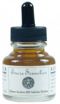 L’encre Sennelier offre une gamme de 29 couleurs, ainsi qu’un diluant à base de gomme laque. Ce diluant permet de conserver la brillance, et la luminosité des teintes tout en leur octroyant une résistance plus grande. Les couleurs sont très saturées, elles sont également à base de gomme laque ce qui leurs confère un aspect légèrement brillant. Elles sont utilisables au pinceau, au calame, ou encore à la plume.