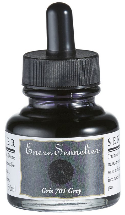 L’encre Sennelier offre une gamme de 29 couleurs, ainsi qu’un diluant à base de gomme laque. Ce diluant permet de conserver la brillance, et la luminosité des teintes tout en leur octroyant une résistance plus grande. Les couleurs sont très saturées, elles sont également à base de gomme laque ce qui leurs confère un aspect légèrement brillant. Elles sont utilisables au pinceau, au calame, ou encore à la plume.