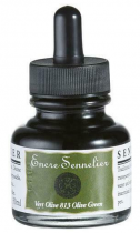 L’encre Sennelier offre une gamme de 29 couleurs, ainsi qu’un diluant à base de gomme laque. Ce diluant permet de conserver la brillance, et la luminosité des teintes tout en leur octroyant une résistance plus grande. Les couleurs sont très saturées, elles sont également à base de gomme laque ce qui leurs confère un aspect légèrement brillant. Elles sont utilisables au pinceau, au calame, ou encore à la plume.