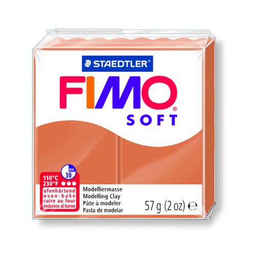 La pâte « Fimo Soft », plus tendre que la « Classic », est une pâte à modeler à cuire facile à travailler et déclinée dans plusieurs coloris.