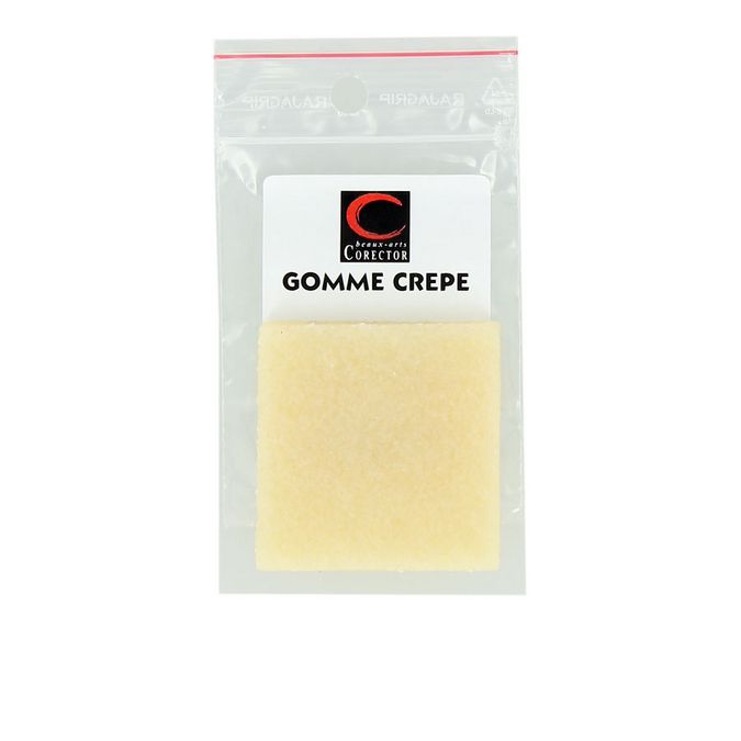 La gomme crêpe dispose d'une texture rugueuse permettant d'enlever les taches de colle liquide, ou le liquide masquage (gomme liquide, frisquette liquide, drawing gum). Dimensions de la gomme : 5 x 5 x 0,5 cm