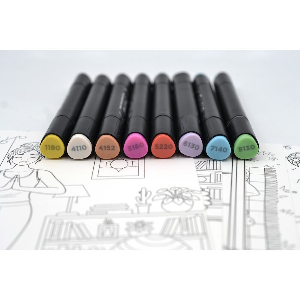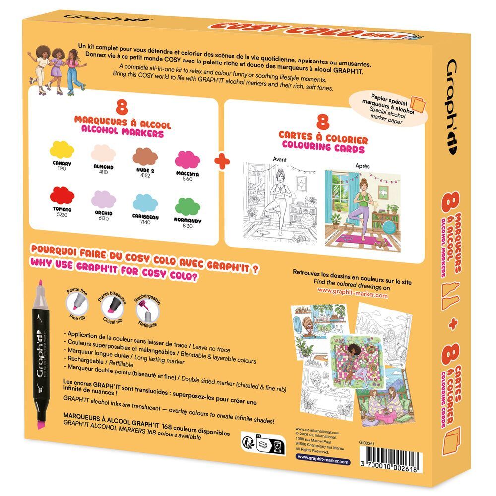 À l’intérieur : 8 marqueurs à alcool GRAPH’IT aux teintes lumineuses et 8 planches à colorier remplies d’illustrations de scènes quotidiennes apaisantes, parfaites pour se poser et laisser parler sa créativité. Un combo parfait pour colorier, déconnecter et se faire du bien.