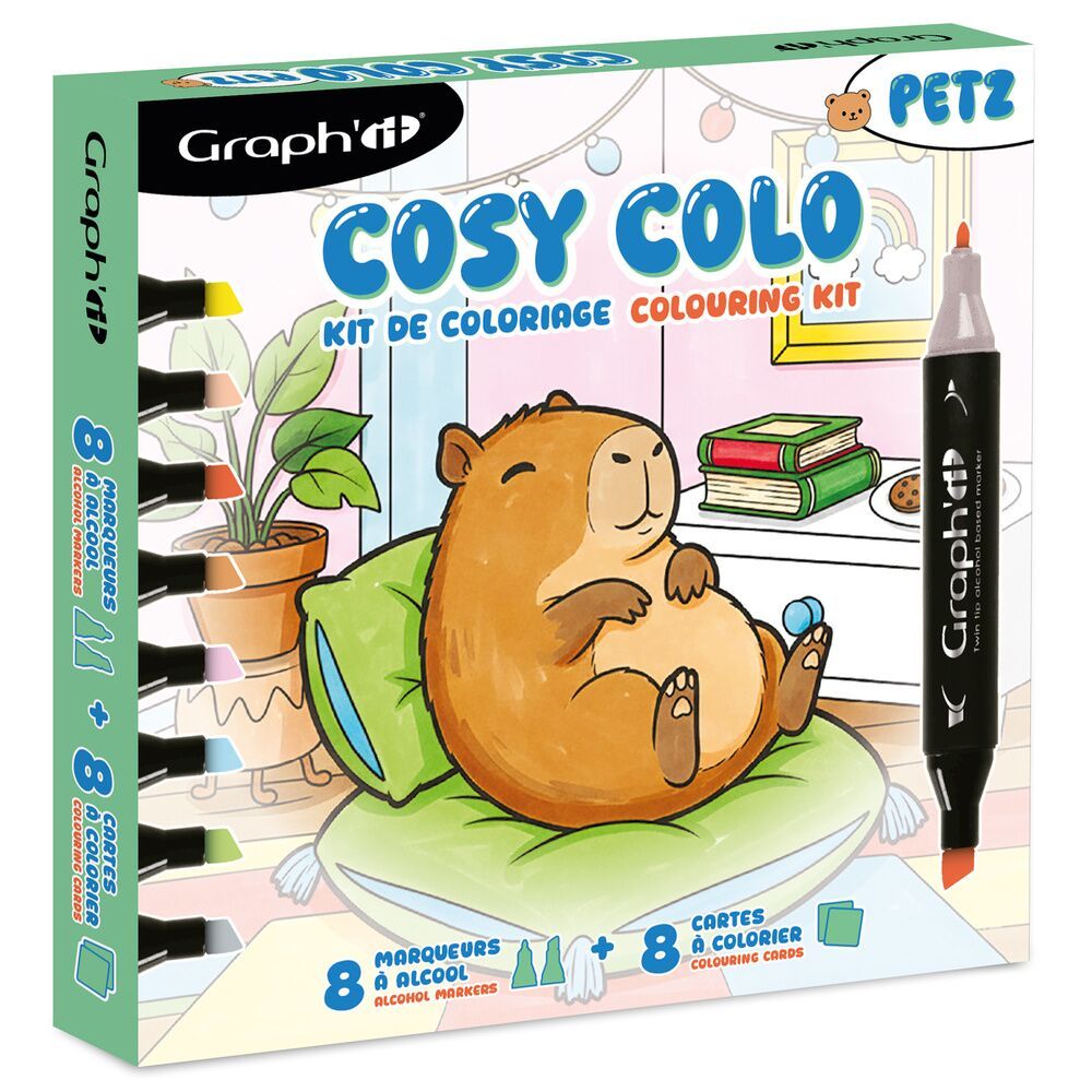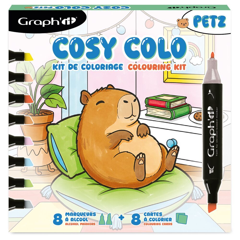 À l’intérieur de ce kit : 8 marqueurs à alcool GRAPH’IT aux couleurs riches et vibrantes, accompagnés de 8 planches à colorier pleines de douceur et de petits animaux adorables en situation de détente. Donnez vie à ce petit monde COSY et laisser filer l’inspiration !