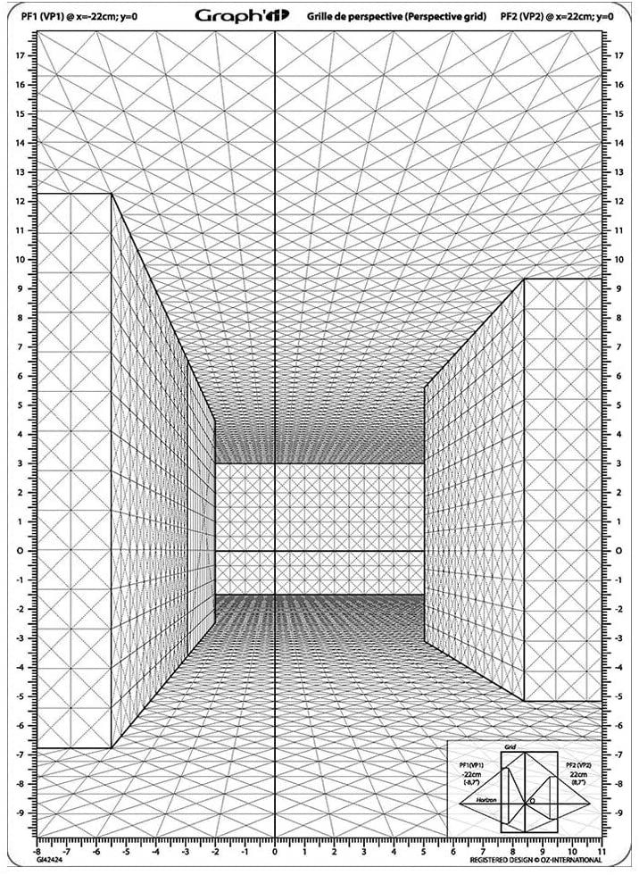 Grilles de perspectives A4 imprimées sur du plastique souple pour intégrer dans une perspective personnages ou objets. Idéal pour table lumineuse en appliquant d’abord la grille de perspective puis la feuille de dessin. Utilisable aussi en transparence sous papier calque ou papier layout. Pour le dessin technique, l’illustration ou la BD.