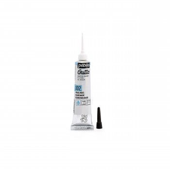 Réf. : 147-002 Gutta à l'eau pour la réalisation de sertis. Elle se travaille directement au tube à canule. Elle traverse parfaitement les fibres de l'étoffe, faisant ainsi barrage aux couleurs Setasilk qui s'appliquent ensuite.