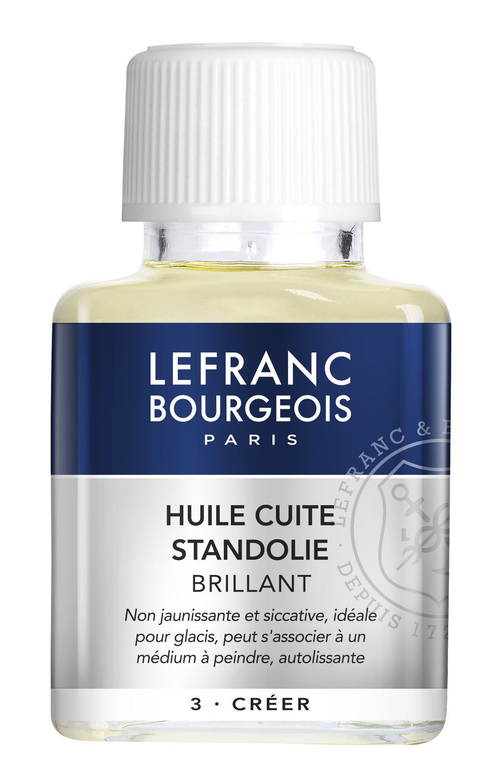 L'huile de Standolie de lin est une huile cuite (polymérisée) qui permet d'arrondir la touche, non jaunissante, qui favorise la brillance et permet de réaliser des glacis. Elle ralentit le séchage et augmente la durabilité du film pictural. Elle est à réserver pour les couches finales.