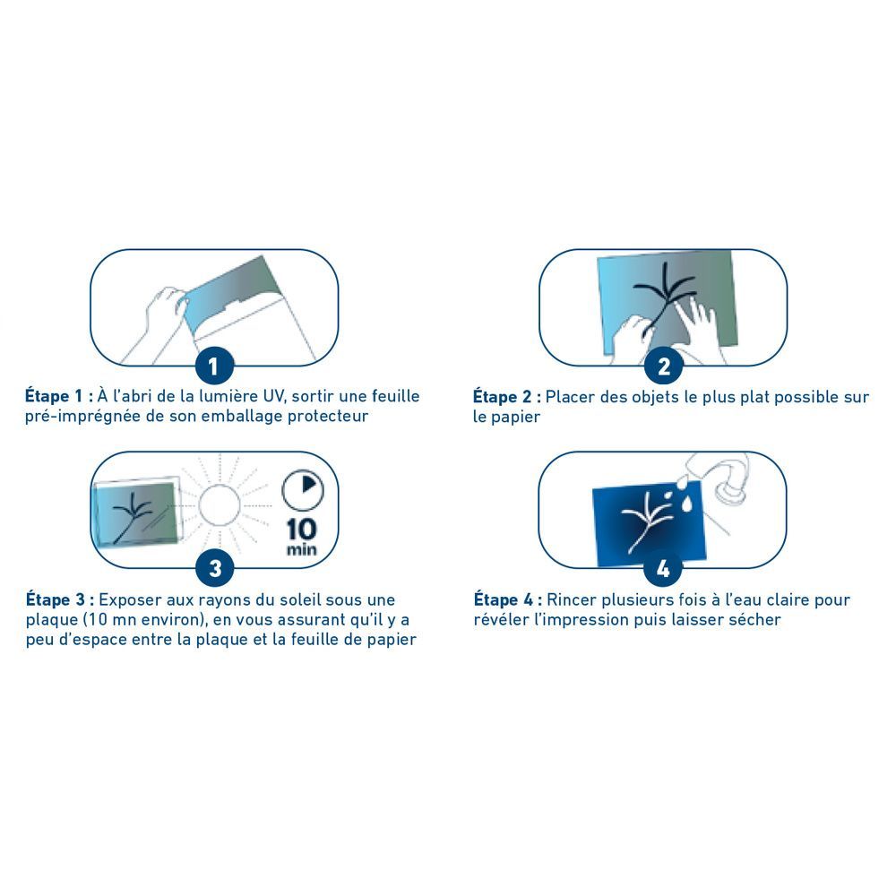 -Simplicité d'utilisation : Les feuilles sont prêtes à l'emploi, il suffit de poser vos objets et d'exposer à la lumière du soleil.