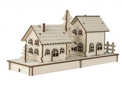 Les 51 éléments en bois 3mm épais coupés au laser peuvent être facilement retirés de la plaque en bois à l'aide du cutter pour bricolage et simplement assemblés en une plateforme avec deux maisons, 3 sapins et 2 clôtures de jardin à l'aide des instructions détaillées et numérotées.