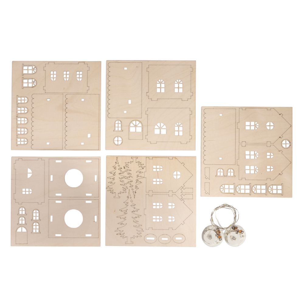 Kit de construction en bois Maisons Illuminées, 48 pièces + 2 guirlandes lumineuses à LED.