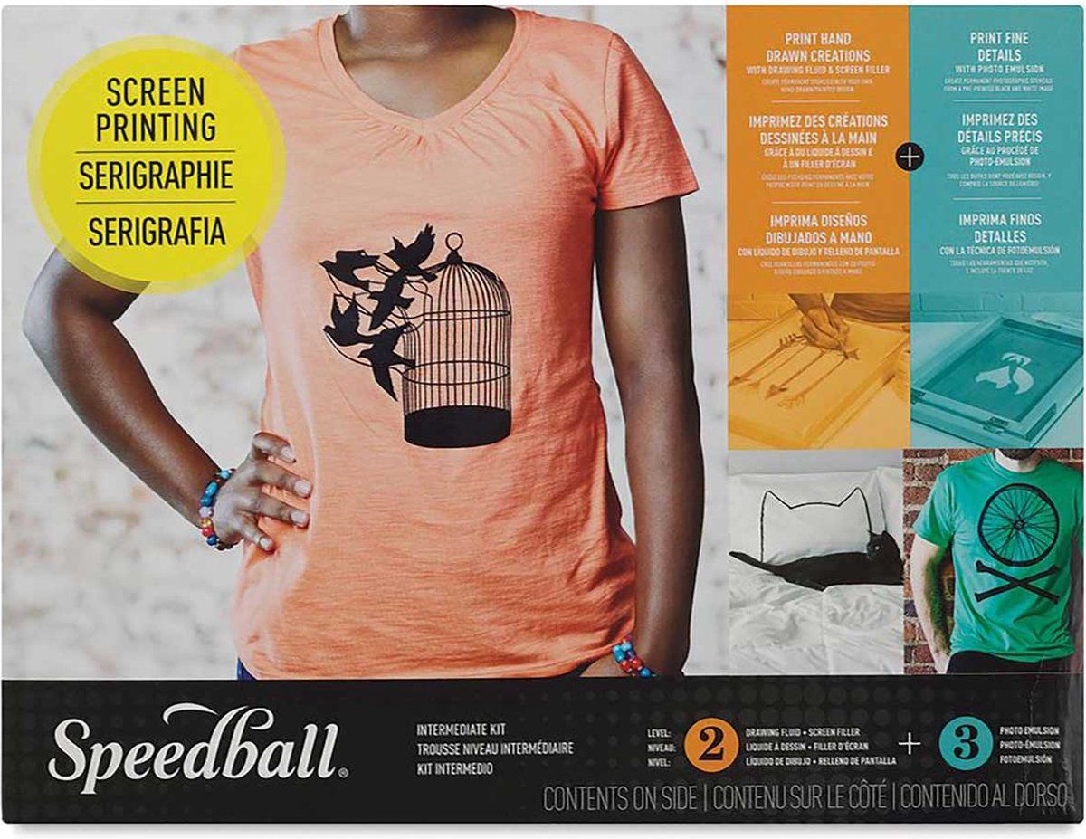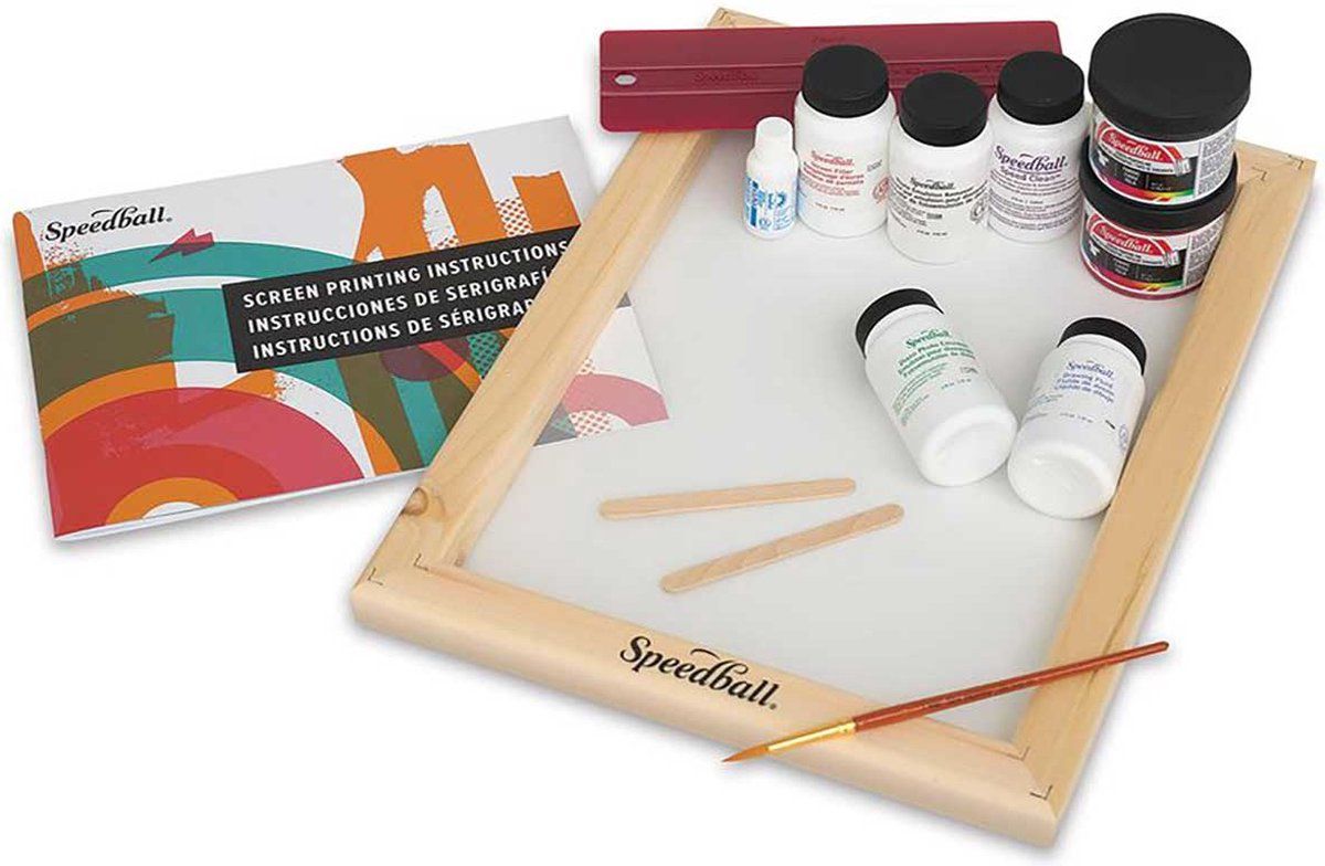 Cet ensemble complet comprend les produits de photo-émulsion, y compris le décapant et le sensibilisateur. Mais aussi un Speedball Wooden Screen Frame, une gomme, de l'encre de sérigraphie et du liquide à dessin !