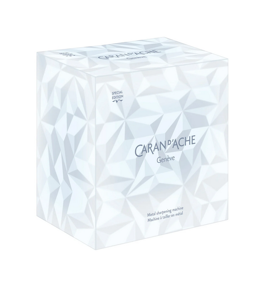 Boîte en carton recouverte de motifs géométriques blancs et bleutés inspirés de l’effet facetté du givre hivernal