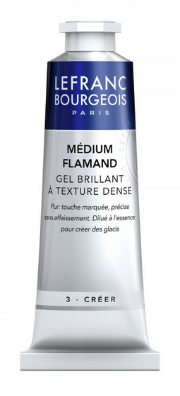 Medium d'une grande souplesse d'emploi pour une application brillante. Assez cher mais idéal pour travailler les traits fins au pinceau. Convient aussi bien pour les couleurs transparentes que les opaques.
