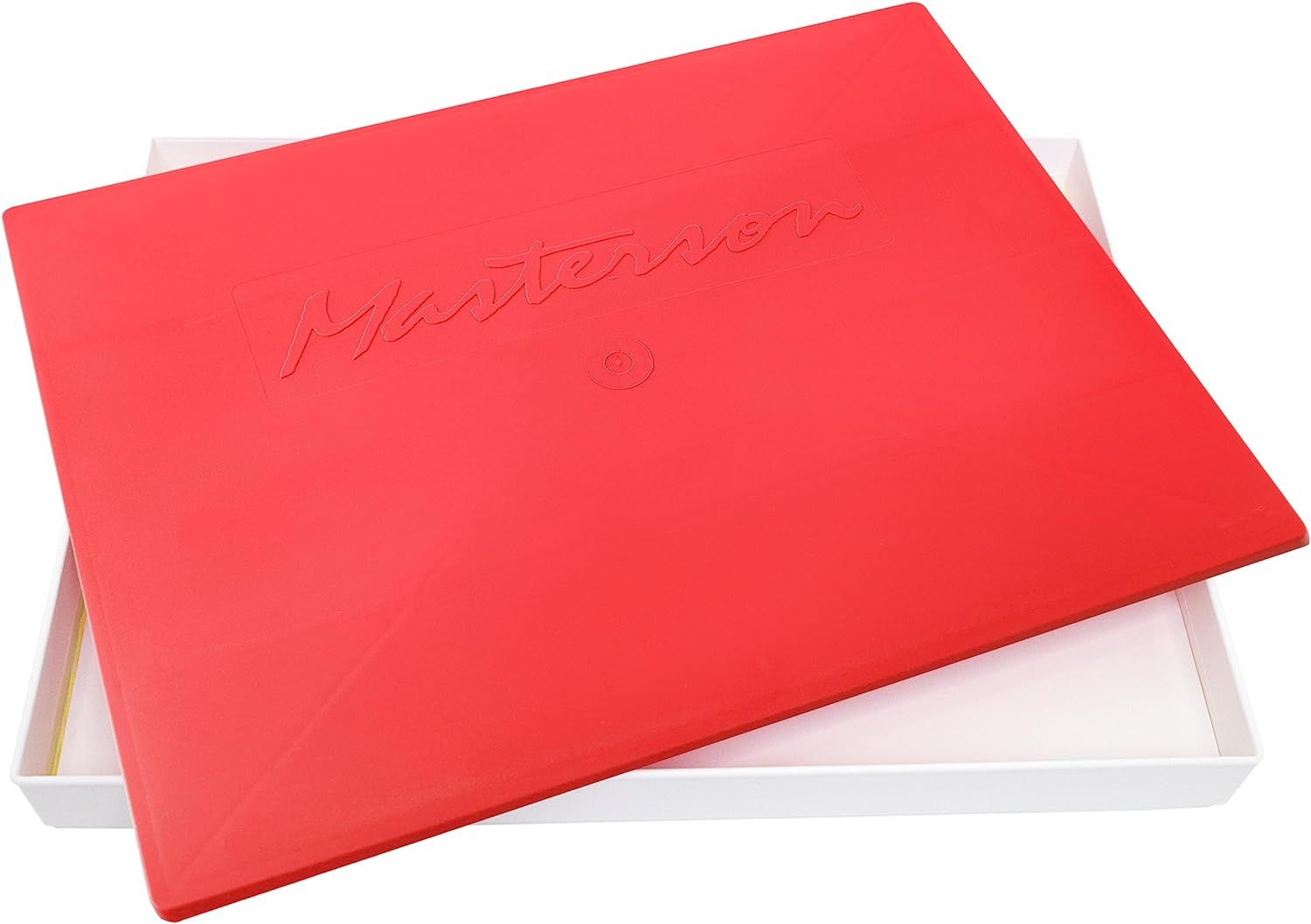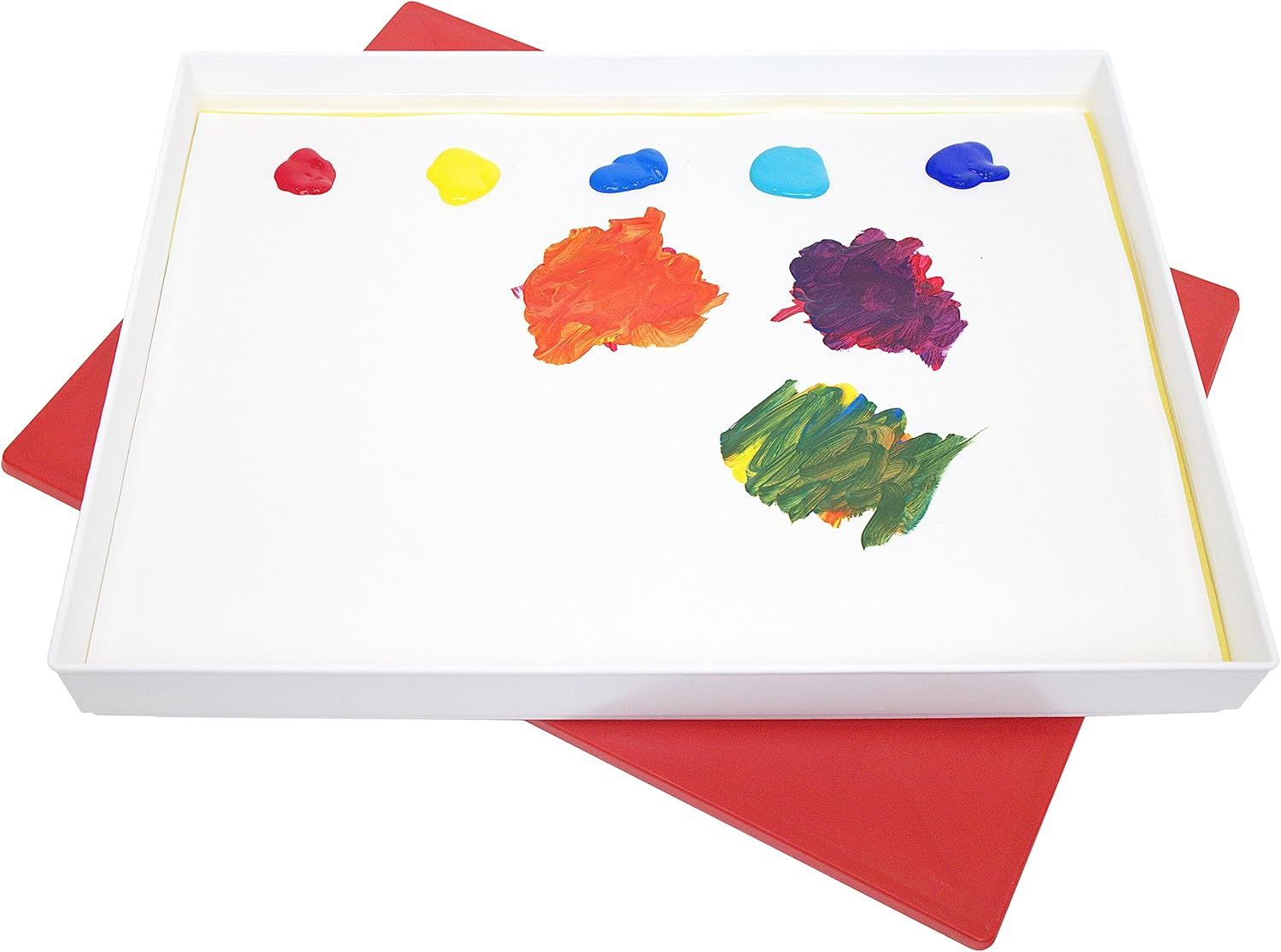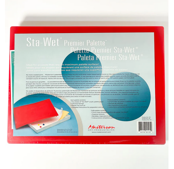 La palette acrylique hermétique dispose d'un insert en éponge breveté et d'un papier spécial perméable. Ensemble, ils fournissent aux acryliques et autres peintures miscibles à l'eau une source constante d'humidité. Humidifiez l'éponge et placez-la dans le plateau de palette de peinture, puis placez le papier palette sur le dessus. Lorsque le couvercle est ouvert, les peintures auront un temps d'ouverture prolongé. Lorsque le couvercle est fermé, la palette Masterson maintiendra une atmosphère humide qui préserve les peintures. En plus de son utilisation avec des peintures miscibles à l'eau, la palette Sta-Wet peut être utilisée comme palette de peinture à l'huile. Pour une utilisation avec des huiles, il suffit d'enlever l'éponge et le papier de palette et d'utiliser la palette de peinture couverte pour stocker les peintures à l'huile (papier de palette d'huile non inclus). Le couvercle dispose de cinq broches qui offrent une stabilité structurelle et empêchent le couvercle de entrer en contact avec les peintures stockées à l'intérieur. La zone de travail pour la palette de mélange est de 30,5 x 40,6 cm, ce qui la rend idéale pour les projets qui nécessitent une surface maximale de palette. Chaque boîte Masterson Palette contient cinq feuilles de papier « Sta-Wet » pour peinture acrylique, une éponge en cellulose, un plateau et un couvercle moulés par injection, et des instructions complètes pour la préparation et l'utilisation. La palette Masterson Sta-Wet Premier est fabriquée aux États-Unis.