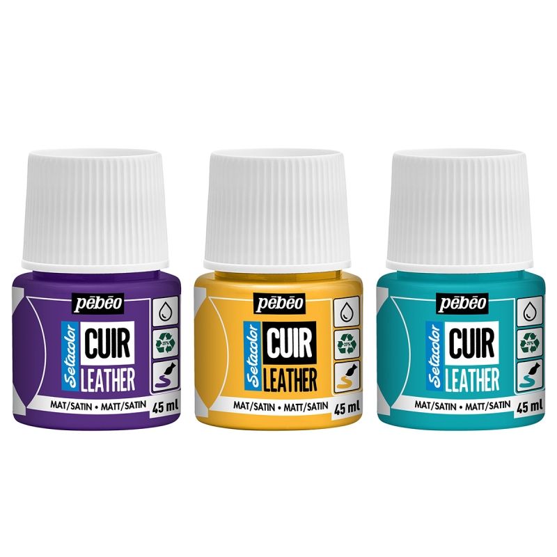 Setacolor Cuir est une gamme de peinture acrylique spécialement conçue pour customiser et réparer le cuir et le simili cuir. Cette gamme propose un nuancier moderne avec des couleurs aux effets uniques : 23 couleurs MATES-SATINÉES, 12 couleurs à effet : METAL, PAILLETTE, FLUORESCENT, PHOSPHORESCENT et DUOCHROME.