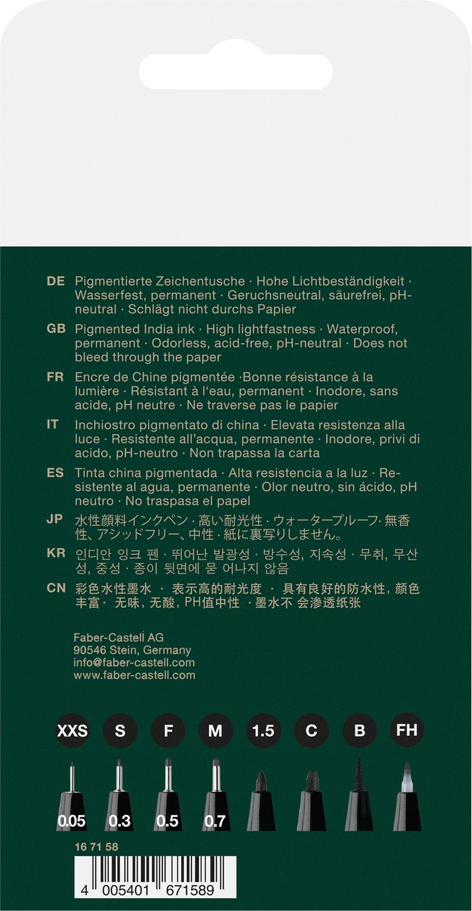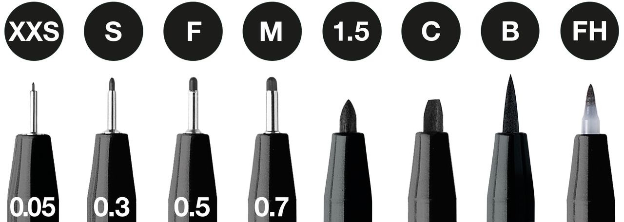 Contenu : XXS = 0.05 mm, S = 0.3 mm, F = 0.5 mm, M = 0.7 mm, B = Pointe de pinceau, C = pointe biseautée 2,5 mm, 1.5 mm, Fude hard = pointe dure de pinceau