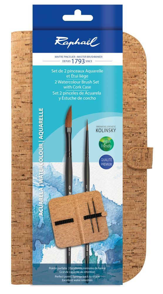 Set de 2 pinceaux aquarelle Raphael en imitation Kolinski dans un étui de rangement en liège.