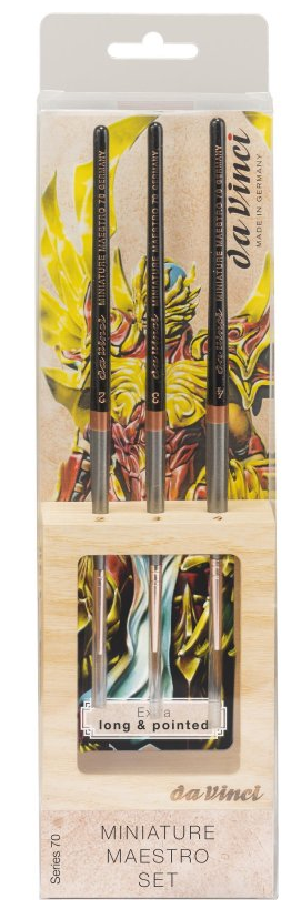 Dans ce set, 3 pinceaux (n°2,3 et 4) de la série 70 MINIATURE MAESTRO, pointe ronde, extra longue et extra pointue en poil de martre rouge Kolinsky sélectionné pour appliquer sur figurines une couche de base et pour les peindre.