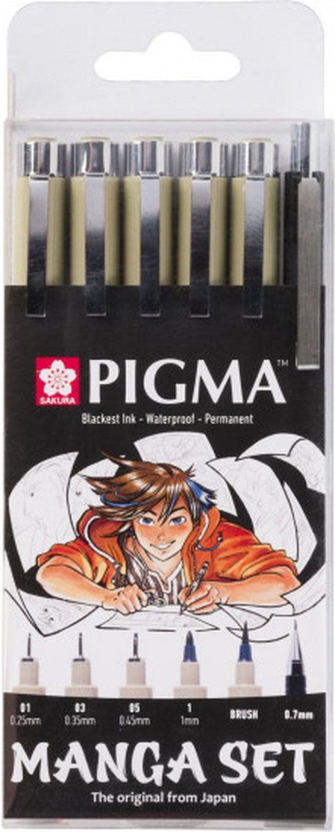 Ce set Sakura Pigma micron Manga se compose de 4 fineliners, 1 stylo pinceau et 1 porte-mine. Les stylos sont fournis avec l'encre Pigma unique, ce qui signifie: permanent, étanche, résistant à la couleur et à la lumière. L'encre coule doucement sur le papier, sèche rapidement, ne macule pas et a une belle couleur noire profonde. Pour ces raisons, les fineliners sont largement utilisés pour l'illustration technique et artistique. Vous pouvez utiliser les stylos sur presque toutes les surfaces poreuses. Les stylos Pigma Micron sont disponibles en différentes couleurs. Ce lot de 6 contient des stylos 01, 03, 05 et 01, un pinceau Pigma Micron et un porte-mine Sakura 0,7 mm.