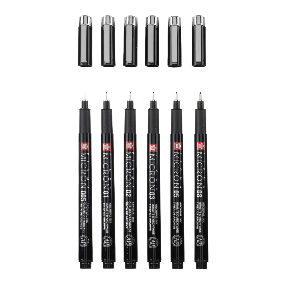 Ce set contient l’intégralité des fineliners Pigma Micron noirs proposés. Les 6 tailles de pointe sont : 1 x 005 (0,2 mm), 1 x 01 (0,25 mm), 1 x 02 (0,30 mm), 1 x 03 (0,35 mm), 1 x 05 (0,45 mm), 1 x 08 (0,50 mm).