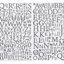 Contient 130 stickers alphabet, chiffre et ponctuation avec deux polices de caractères : majuscules et minuscules (Arial et Times), idéal pour créer des effets de style.